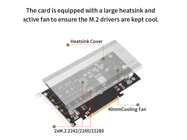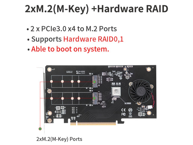 • 1 x PCIe x 16 to 2 x M.2(M-Key) card